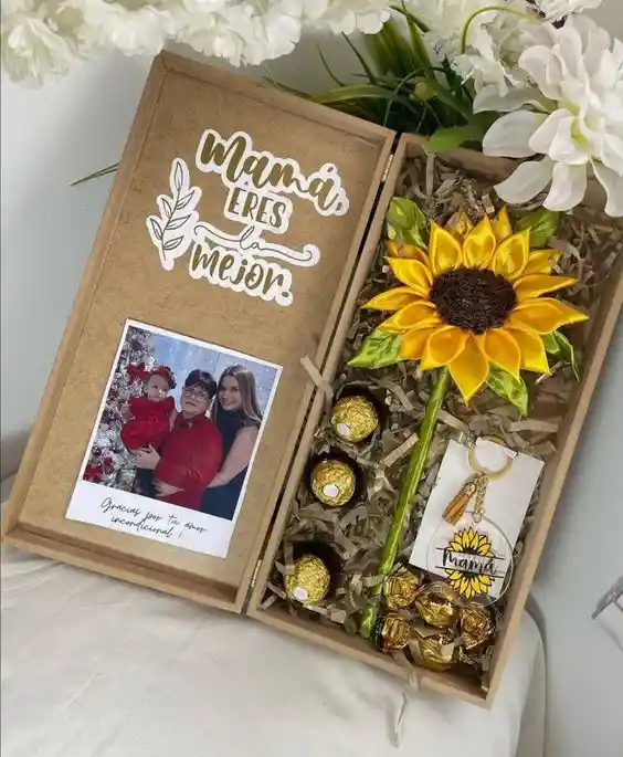 Incluye: Girasol x1 ( flor real ), ferrero rocher x3, borbuja jet x2, mensaje de madre eres la mejor, decoracion en caja de madera, mensaje personalizado y foto la cual debe de enviarse al wpp 3006861625 junto con el nombre de la persona que realiza el pedido