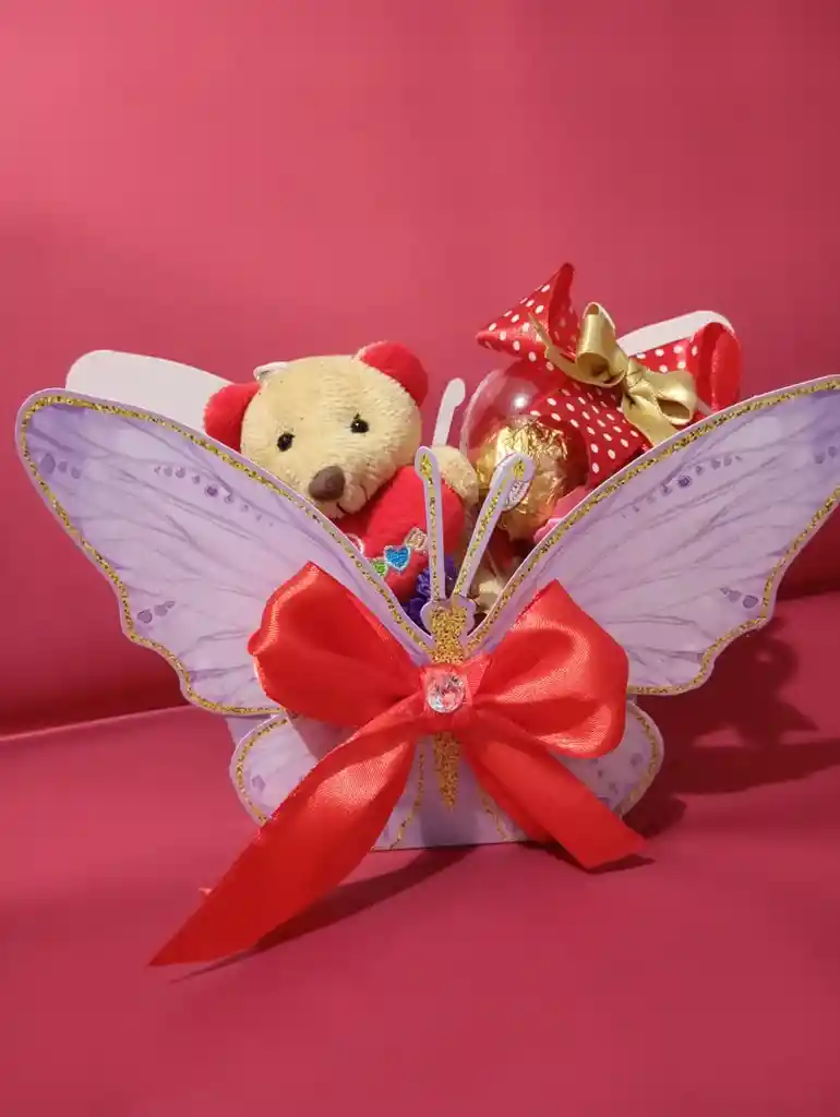 Arreglo en caja forma de mariposa, chocolates en corazon acrilico, llavero en oso y luz led
