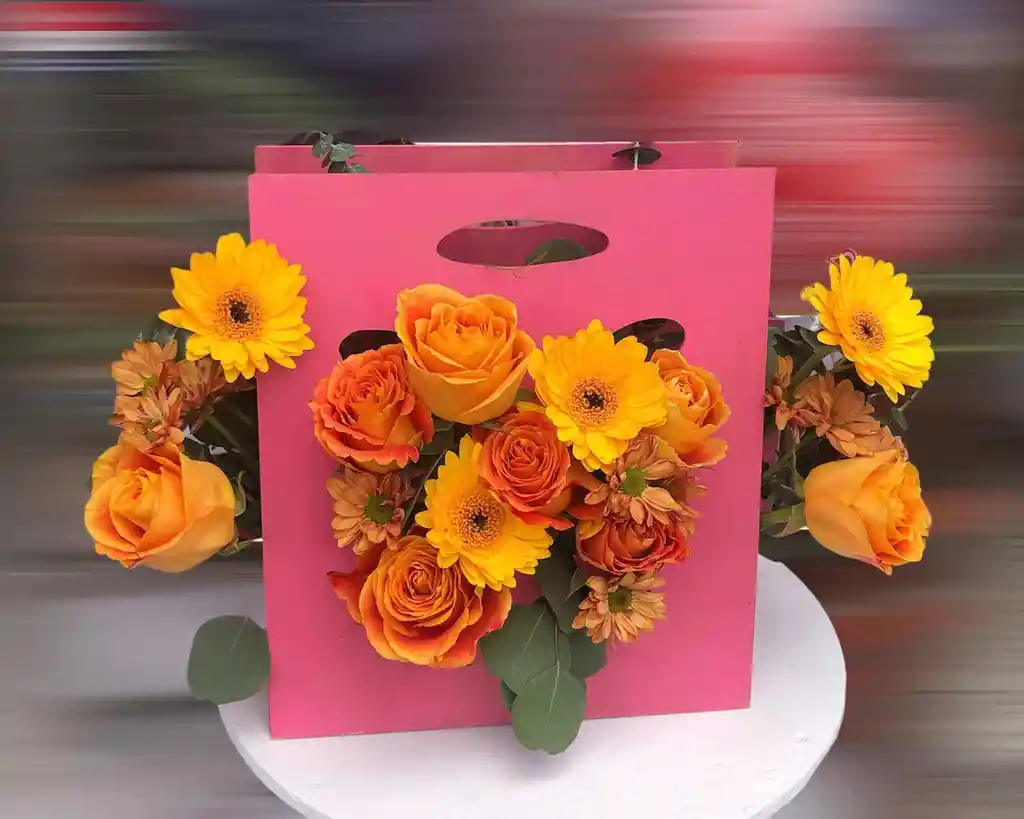 Caja de madera en forma de cartera con figura de mariposa (color según disponibilidad) con flores variadas en colores vivos