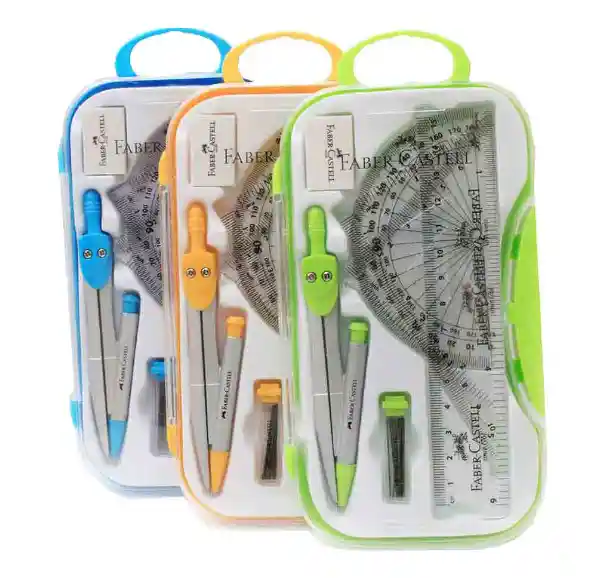 El kit matemático tendrá lo necesario para trabajar en clases de dibujo técnico, matemáticas, artes, escritura. Todo lo que necesitas en un solo kit. caja plástica y compas metálico para mayor seguridad - Contiene: 1 escuadra de 45º de 12 cm - 1 escuadra de 60º de 12 cm - 1 regla de 15 cm -1 compás -1 borrador de nata -1 caja de minas -Regla de 15 cm -Transportador 180º