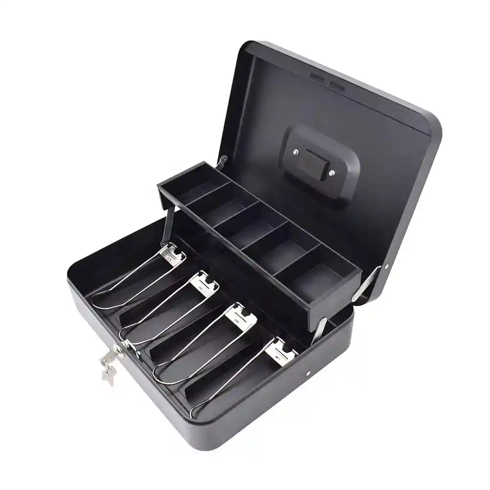 Caja registradora metálica, 4 puestos para billetes y 5 puestos para monedas, medida de 24x30x10cm Incluye varias ranuras para billetes y un compartimento superior extraíble para monedas. Cuenta con un mecanismo de cierre seguro con llave para proteger el contenido. Diseñada para ser portátil y utilizada en cajas registradoras o para guardar dinero de forma segura. Fabricada en metal resistente, generalmente acero, para mayor durabilidad.