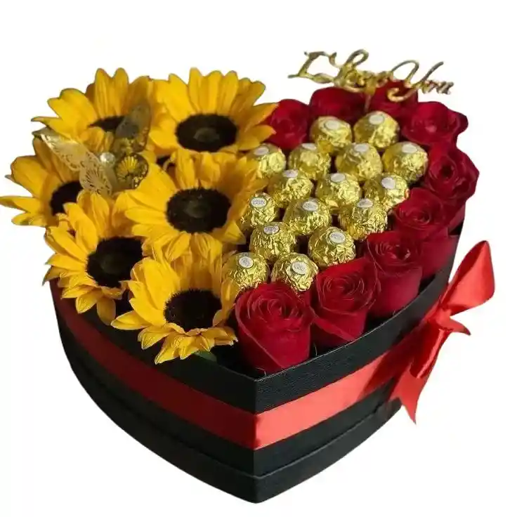 Caja en forma de corazón con 9 rosas, 6 girasoles y 18 chocolates con una mariposa Nota: La flor puede ser sustituida dependiendo la disponibilidad de color y del producto “Mensaje Personalizado” máximo de 30 caracteres (Dejar el mensaje en el chat, los comentarios no se previsualizan para la tienda por lo que si se dejan allí no podrá ser incluido).