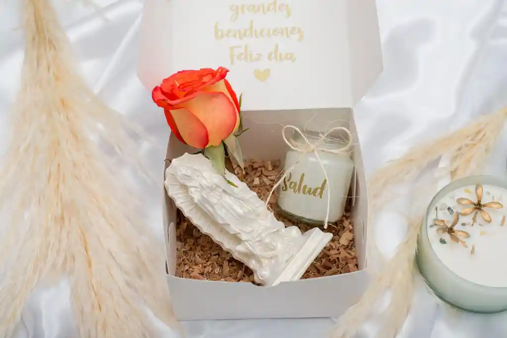 Caja Mini con Virgen de Guadalupe 12Cms, Rosa color a elección según disponibilidad de Temporada y Vela