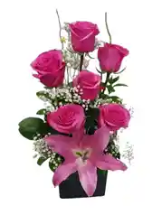 Caja mini de 6 rosas rosadas con 1 lirio rosado y gypso y rusco Nota: La flor puede ser sustituida dependiendo de la disponibilidad de color y del producto. "Mensaje Personalizado" máximo de 30 caracteres (Dejar el mensaje en el chat, los comentarios no se previsualizan para la tienda, por lo que si se dejan allí no podrá ser incluido).