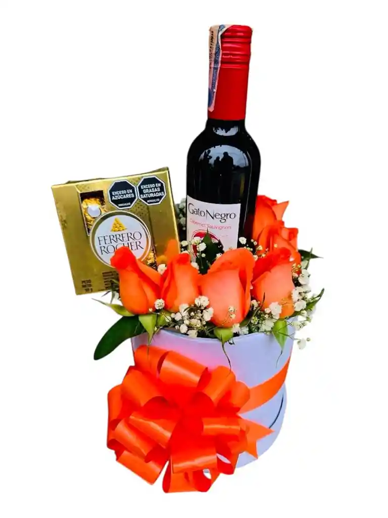 Arreglo floral x6 rosas tipo exportación en tonalidad salmón Chocolates ferrero rocher caja x4 unidades Botella de vino gato negro 375ml Follaje fino brillantina, gipsófilia Moño en satín naranja Diseño elaborado en caja de cartón troquelado 15x15 en forma redonda blanca