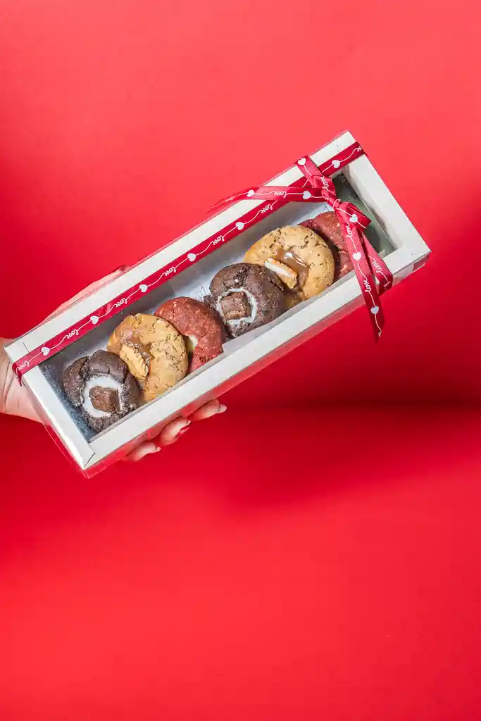 Mini galletas artesanales de textura suave con centro cremoso, sabores equilibrados y combinaciones exquisitas contiene 6 minis galletas de sabores: Red Velvet con chocolate blanco Triple chocolate con Brownie melcochudo Arequipe con chocolate blanco y vainilla. Decorada con hermoso moño en cinta tela, ideal para una fecha especial o consentirte.