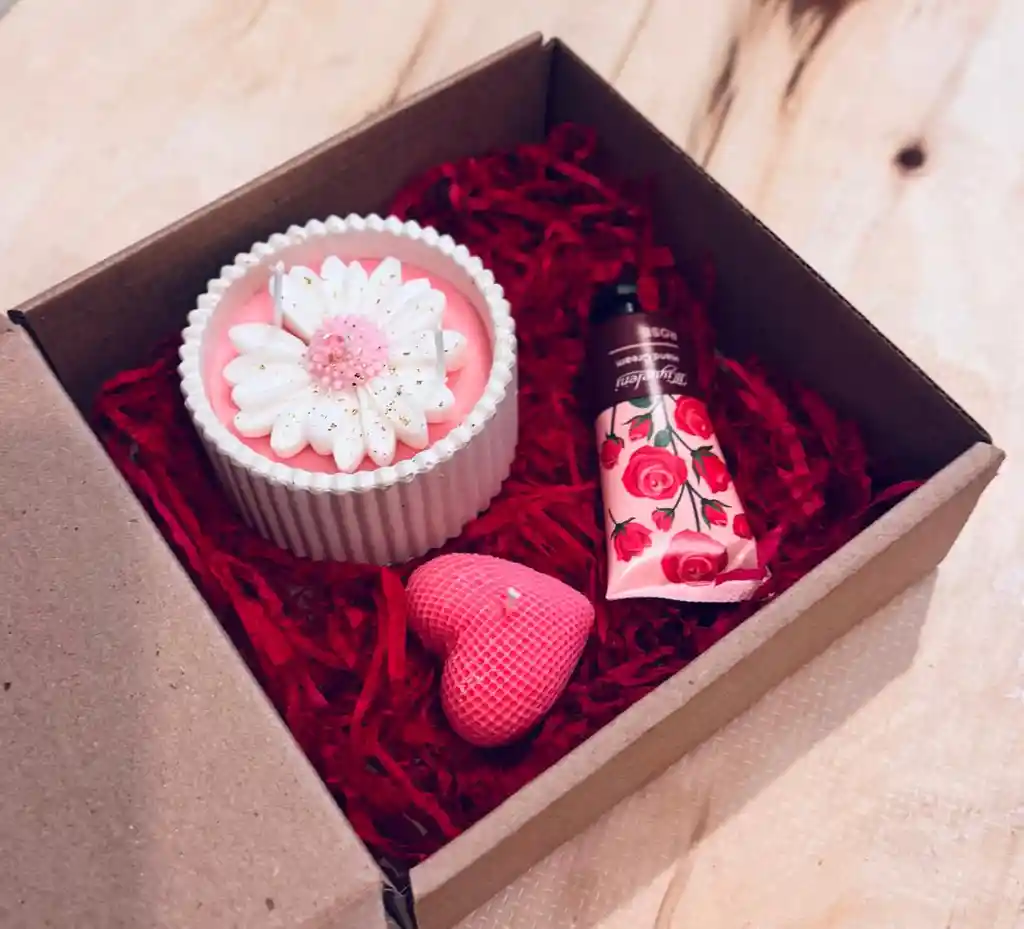 Caja "Momentos Dulces" Descubre un detalle pensado para consentirte: ✨ Una vela en elegante recipiente de yeso con un delicioso aroma que llena el ambiente de calma y bienestar. ✨ Una suave crema de manos tamaño mini, perfecta para cuidar y mimar tu piel en cualquier momento. ✨ Y una delicada vela pequeña en forma de corazón, ideal para darle un toque especial a cualquier rincón. Todo lo que necesitas para disfrutar de un momento único y lleno de encanto. La caja se entrega decorada con un moño, una tarjeta con el mensaje Especially for you y una bolsa ecológica de cartón, lista para que puedas dar tu regalo con un toque especial