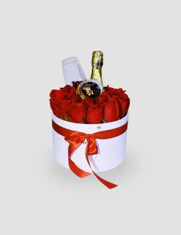 Caja redonda blanca con 16 rosas rojas y champagne JP Mini. La flor puede ser personalizada dependiendo de su disponibilidad.