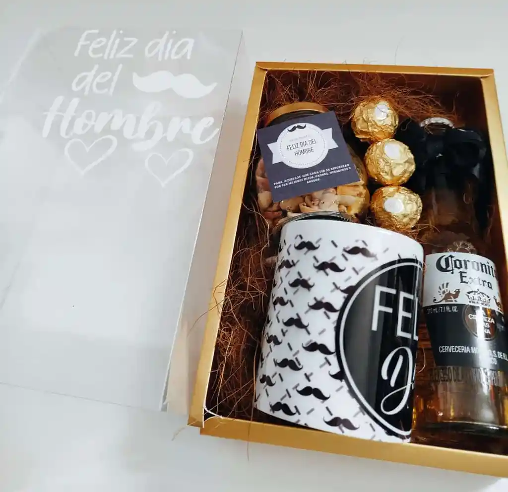 1 Cerveza corona 1 Frasco con frutos secos 3 Ferrero Rocher 1 caja estilo acetato lazos decorativos 1 tarjeta personalizada