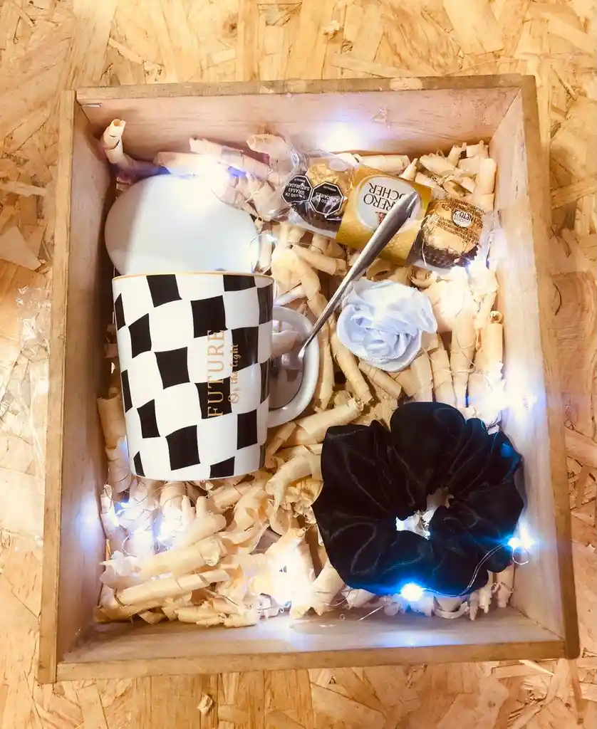 Caja Mug Black and White contiene Caja de madera decorada, mug Black and White con tapa y cuchara, scrunchies de satín, rosa eterna, chocolates ferrero y luces led. Ideal para regalar de día de la madre día de la secretaria día del maestro Cumpleaños