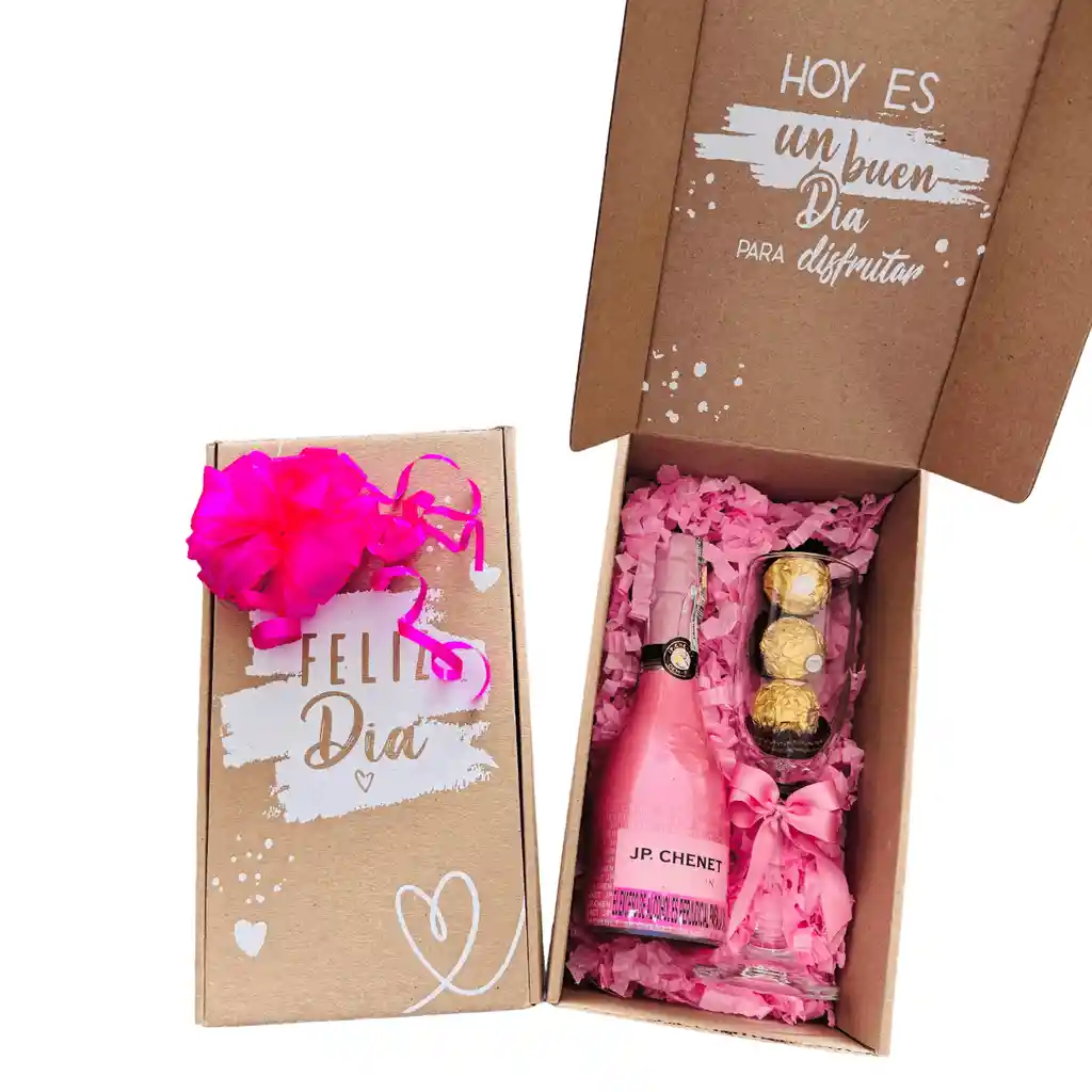 CAJA MUJER JP CHENET - Incluye: 1 Botella de Vino Espumoso JP Chenet Rose 200ml 1 Copa de vidrio para Champagne 3 Unidades de Ferrero Rocher 37.5g Caja rectangular impresa por fuera (FELIZ DIA) y por dentro (Hoy es un buen dia para disfrutar) 25x14x8 Papel picado, moño y tarjeta de Amor y Amistad (DE-PARA). La caja se envia en una bolsa de papel sellada. NOTA: Si deseas que marquemos su tarjeta DE y PARA escribir en "COMENTARIO AL SHOPPER"