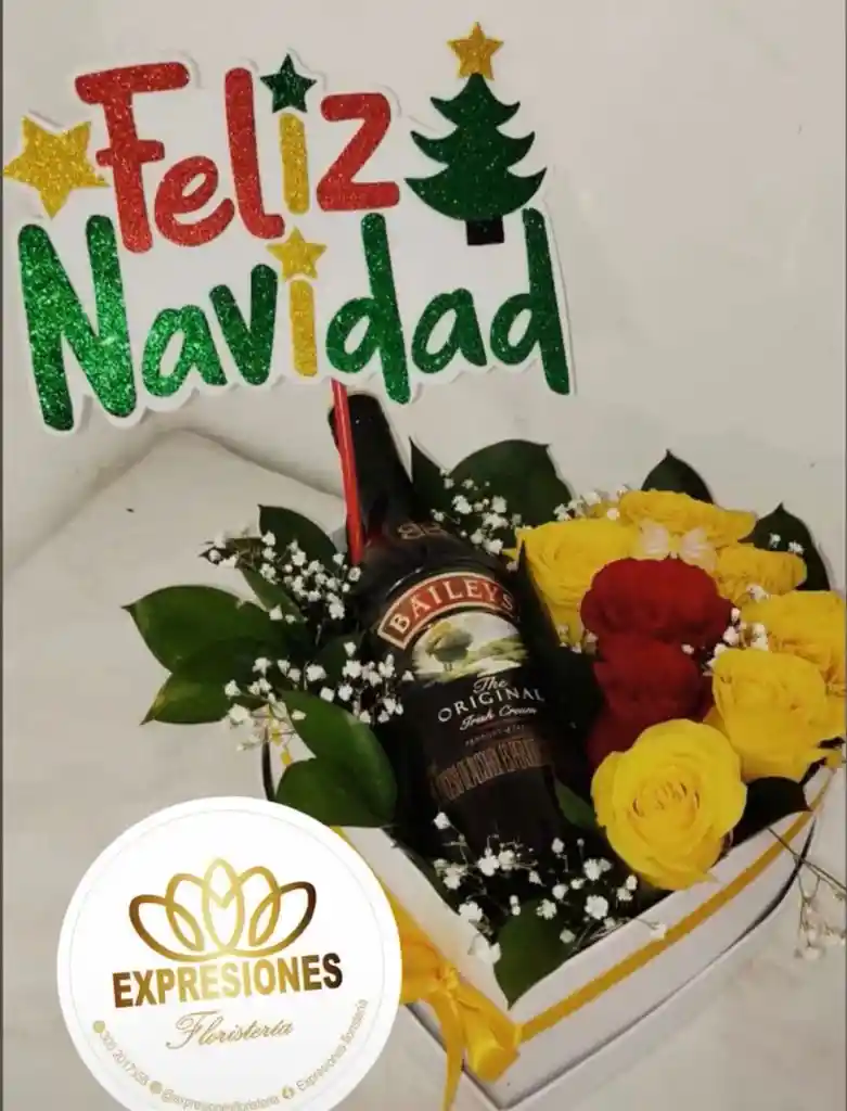 Rosas Caja corazón Botella baileys Pin navidad Follajes