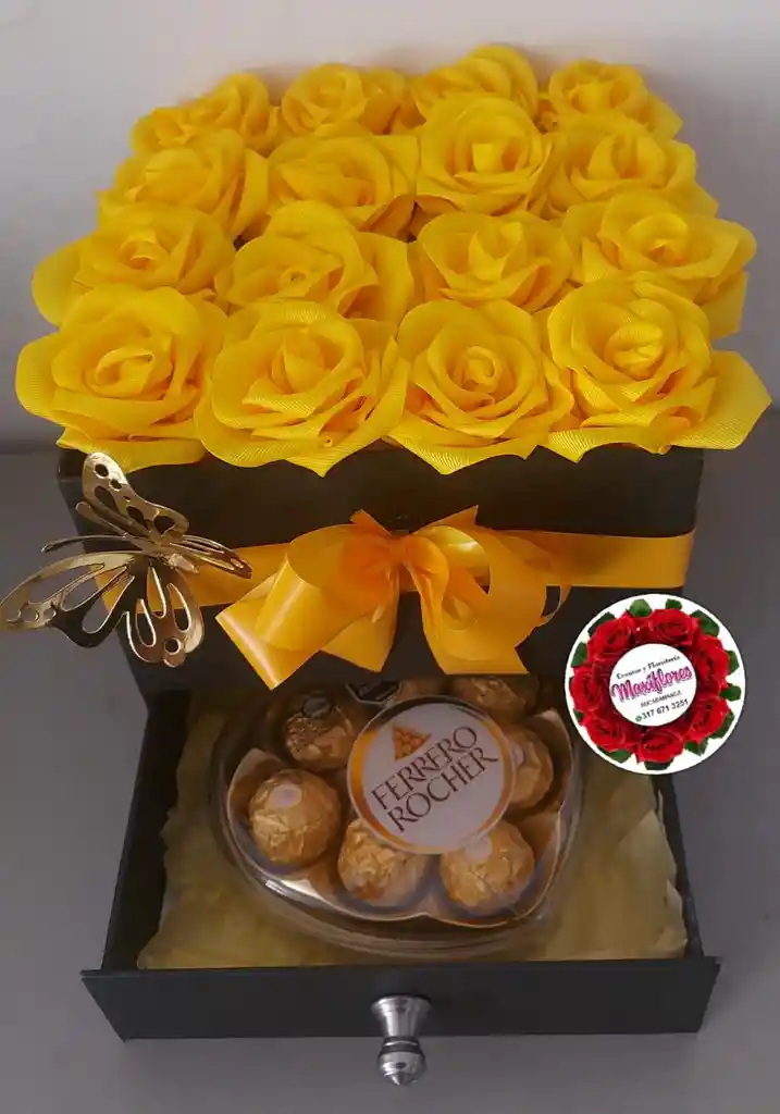 Caja negra de doble piso con rosas amarillas artificiales y una caja de chocolates en forma de corazón. Un regalo sofisticado y dulce que combina elegancia y deleite, perfecto para cualquier ocasión especial.