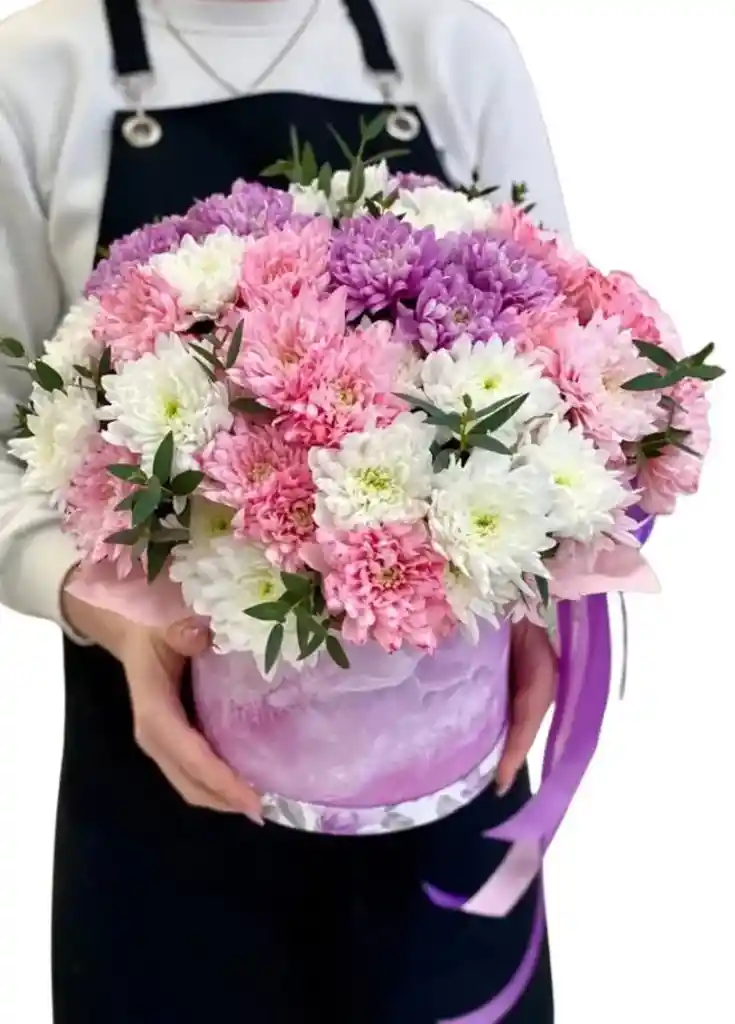 Caja redonda morada clara de 40 crisantemos entre rosados , morados y blancos y 10 varas de rusco Nota: La flor puede ser sustituida dependiendo la disponibilidad de color y del producto “Mensaje Personalizado” máximo de 30 caracteres (Dejar el mensaje en el chat, los comentarios no se previsualizan para la tienda por lo que si se dejan allí no podrá ser incluido).