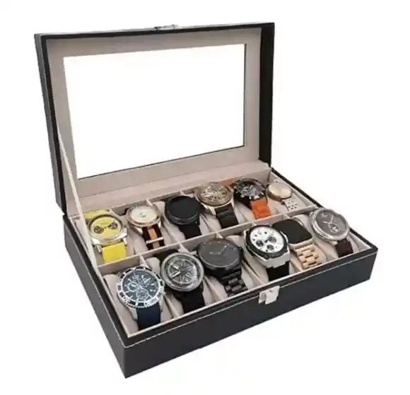 "Es la solución perfecta para quienes desean mantener sus relojes protegidos y ordenados con estilo. Con capacidad para almacenar hasta 12 piezas, permiten una mejor organización y visualización de tu colección. Su diseño elegante y moderno en materiales resistentes asegura durabilidad y protección contra polvo, rayaduras y golpes. El interior acolchonado cuida cada reloj de manera individual, evitando daños por contacto. Posee una tapa transparente que facilita la identificación rápida de cada pieza. El cierre seguro brinda tranquilidad al almacenar objetos de valor. Es ideal tanto para uso personal como para exhibición en joyerías o tiendas especializadas. Fácil de transportar por su tamaño compacto y funcional. Añade un toque de sofisticación y orden a tu colección de relojes."