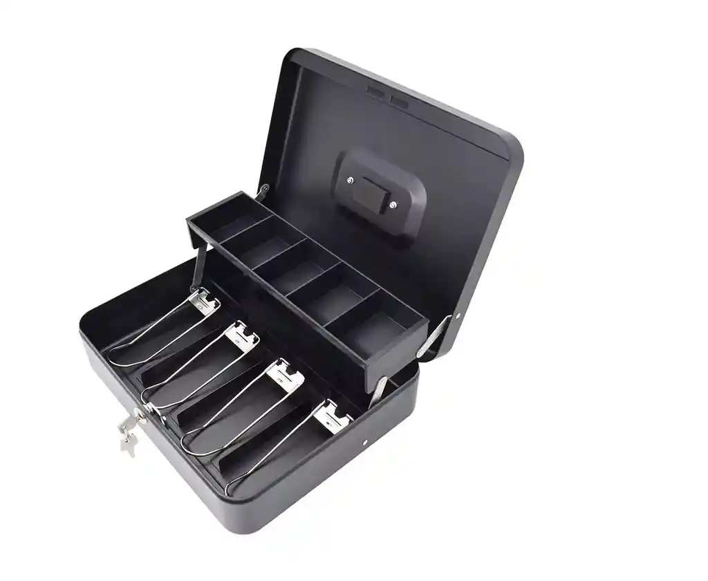 Caja registradora metálica, 4 puestos para billetes y 5 puestos para monedas, medida de 24x30x10cm