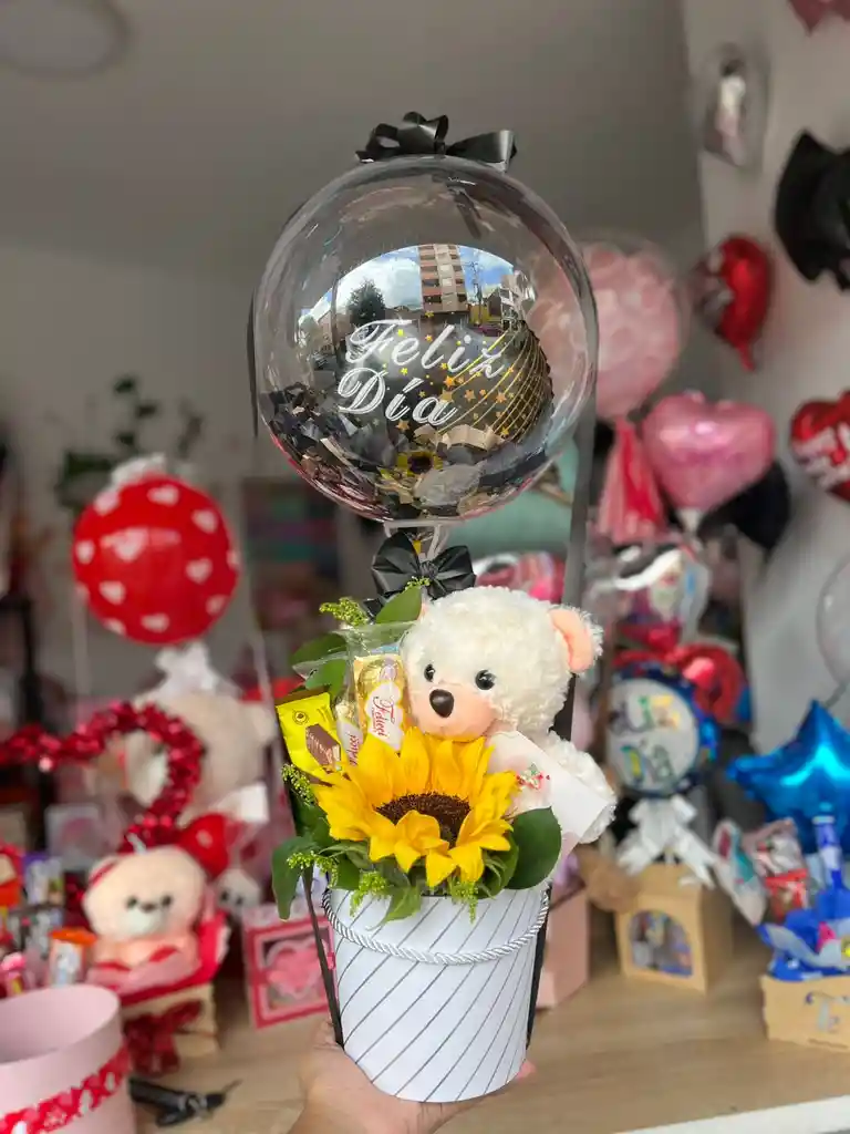 Caja circular (varía según disponibilidad), peluche de oso (varía según disponibilidad), girasol x1, chocolate tipo Ferrero x3, chocolatina kick x1, globo burbuja personalizado, mensaje personalizado.