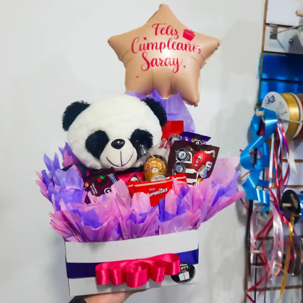 Caja decorada acompañada de peluche oso panda, chocolate morenitas, choco disk, ferrero rocher, mm, chocolate gol, gomas. Para una mayor atención personalizada y ultimar detalles comunícate al WhatsApp 3142273513.