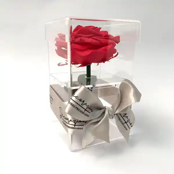 Caja en acrílico con 1 rosa premium natural preservada que dura intacta por meses. Medidas: de 17x10x10cm. Incluye Bolsa de lujo y tarjeta