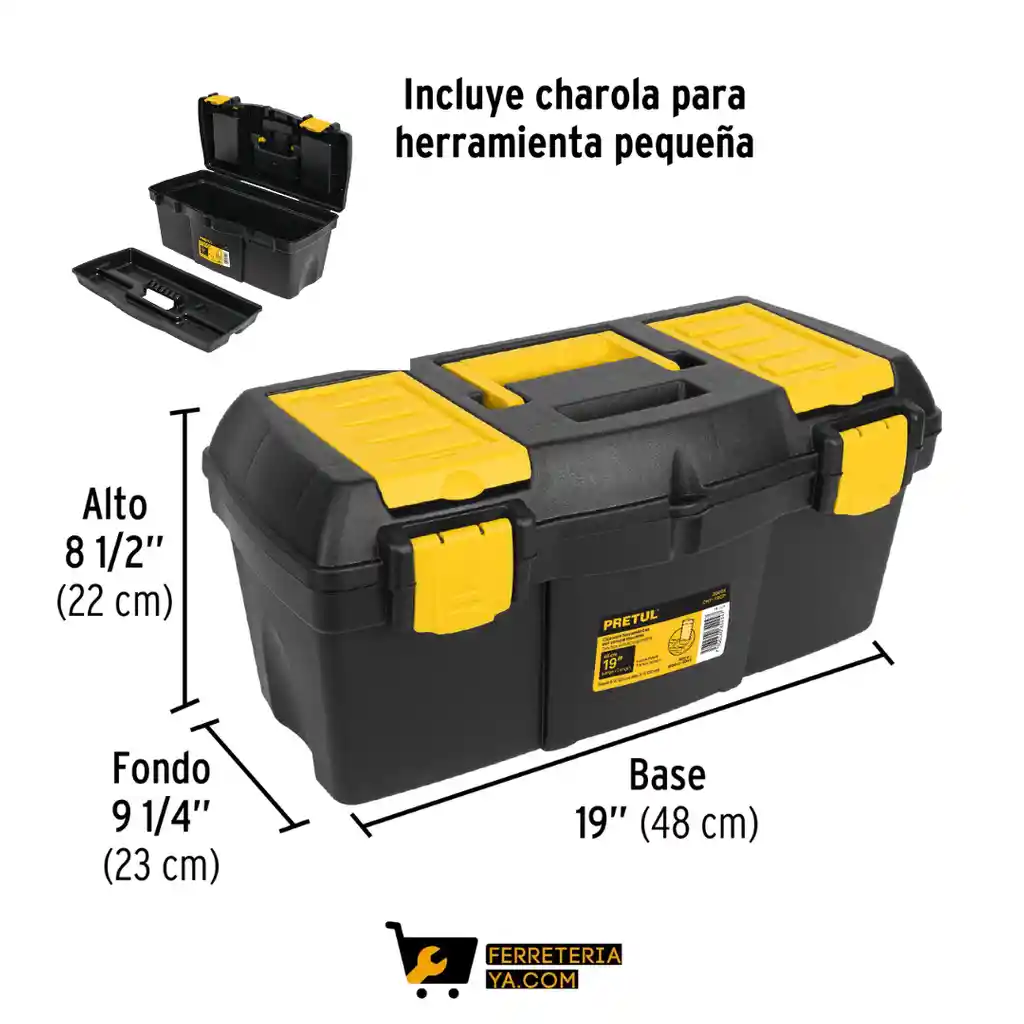 Caja para herramienta de 19" con compartimentos, PRETUL Fabricada en polipropileno Broches plásticos Compartimentos superiores en la tapa para almacenar piezas pequeñas sin necesidad de abrir la caja Manija con diseño ergonómico para transportar cómodamente ESPECIFICACIONES Base 19" (48 cm) Alto 8 1/2" (22 cm) Fondo 9 1/4" (23 cm) Peso 1.4 kg