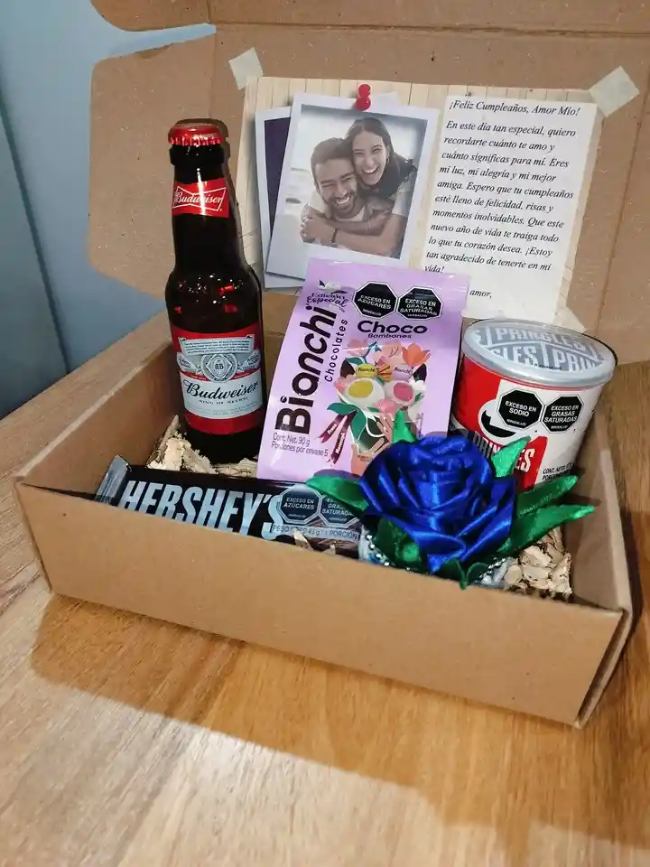 Nuestra Caja Pasabocas con Budweiser está diseñada para convertir cualquier ocasión en un momento especial e inolvidable. Este encantador set incluye: Botella de Cerveza Budweiser de 200 ml: Disfruta de la cerveza lager icónica, conocida por su sabor equilibrado y refrescante, perfecta para relajarse y disfrutar. Lata Pequeña de Papas Pringles: La clásica y crujiente opción que todos aman, en un tamaño conveniente para disfrutar en cualquier momento. Chocolate Kinder Bueno: Deléitate con el delicioso sabor de este chocolate, con su relleno cremoso y suave que lo convierte en un favorito de todos. Chocolates MMs: Los coloridos y divertidos chocolates, ideales para compartir y disfrutar, puedes elegir entre rellenos de maní o solo chocolate. Mix de Nueces La Especial: Una mezcla exquisita de nueces seleccionadas, perfecta para un snack saludable y sabroso, puedes elegir entre mix de arándanos o pasas. Para hacer este regalo aún más especial, la caja viene decorada con una foto personalizada, un mensaje especial que expresa tus sentimientos y una flor eterna que simboliza la belleza duradera y el cariño eterno.