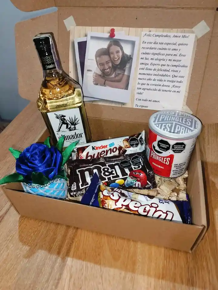 Nuestra Caja Pasabocas con Tequila está diseñada para convertir cualquier ocasión en un momento especial e inolvidable. Este encantador set incluye: Media Botella de Tequila Reposado El Jimador de 375 ml: Disfruta de este exquisito tequila reposado, reconocido por su suavidad y sabor único, perfecto para celebrar momentos especiales. Lata Pequeña de Papas Pringles: La clásica y crujiente opción que todos aman, en un tamaño conveniente para disfrutar en cualquier momento. Chocolate Kinder Bueno: Deléitate con el delicioso sabor de este chocolate, con su relleno cremoso y suave que lo convierte en un favorito de todos. Chocolates MMs: Los coloridos y divertidos chocolates, ideales para compartir y disfrutar, puedes elegir entre rellenos de maní o solo chocolate. Mix de Nueces La Especial: Una mezcla exquisita de nueces seleccionadas, perfecta para un snack saludable y sabroso, puedes elegir entre mix de arándanos o pasas. Para hacer este regalo aún más especial, la caja viene decorada con una foto personalizada, un mensaje especial que expresa tus sentimientos y una flor eterna que simboliza la belleza duradera y el cariño eterno.