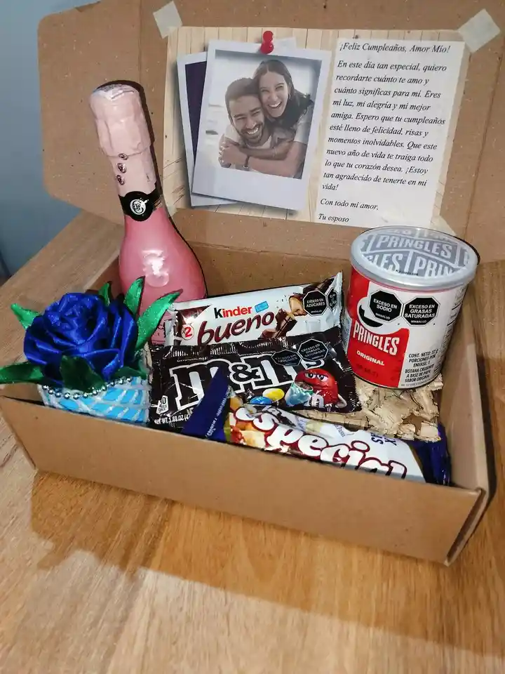 Nuestra Caja Pasabocas con Vino Espumoso está diseñada para convertir cualquier ocasión en un momento especial e inolvidable. Este encantador set incluye: Botella pequeña de Vino Espumoso JP Chenet Rose de 200 ml: Disfruta de este exquisito vino espumoso rosado, reconocido por su delicado sabor frutal y sus burbujas refrescantes, perfecto para celebrar momentos especiales. Lata Pequeña de Papas Pringles: La clásica y crujiente opción que todos aman, en un tamaño conveniente para disfrutar en cualquier momento. Chocolate Kinder Bueno: Deléitate con el delicioso sabor de este chocolate, con su relleno cremoso y suave que lo convierte en un favorito de todos. Chocolates MMs: Los coloridos y divertidos chocolates, ideales para compartir y disfrutar, puedes elegir entre rellenos de maní o solo chocolate. Mix de Nueces La Especial: Una mezcla exquisita de nueces seleccionadas, perfecta para un snack saludable y sabroso, puedes elegir entre mix de arándanos o pasas. Para hacer este regalo aún más especial, la caja viene decorada con una foto personalizada, un mensaje especial que expresa tus sentimientos y una flor eterna que simboliza la belleza duradera y el cariño eterno.