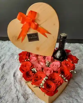 18 a 22 Rosas, botella de crema de whisky, caja versátil en forma de corazón *Color de la rosa puede variar de acuerdo a disponibilidad.