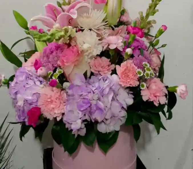 arreglo redondo en caja, en tonos pasteles, elaborado con diferentes tipos de flores