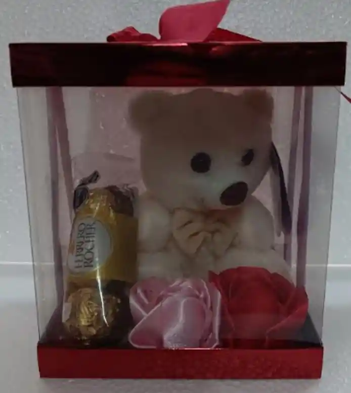 caja peluche contiene caja acetato 17x15x15 cm peluche de 15cm 2 rosas artificiales en tela 1 chocolate ferrero x 3 und