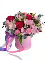 Una delicada combinación de flores con 6 rosas rojas , 1 paquete de astromelia rosada y 10 claveles rosas con eucalipto en una caja redonda, ideal para expresar afecto y elegancia con un toque de frescura y armonía. Nota: La flor puede ser sustituida dependiendo de la disponibilidad de color y del producto. "Mensaje Personalizado" máximo de 30 caracteres (Dejar el mensaje en el chat, los comentarios no se previsualizan para la tienda, por lo que si se dejan allí no podrá ser incluido).