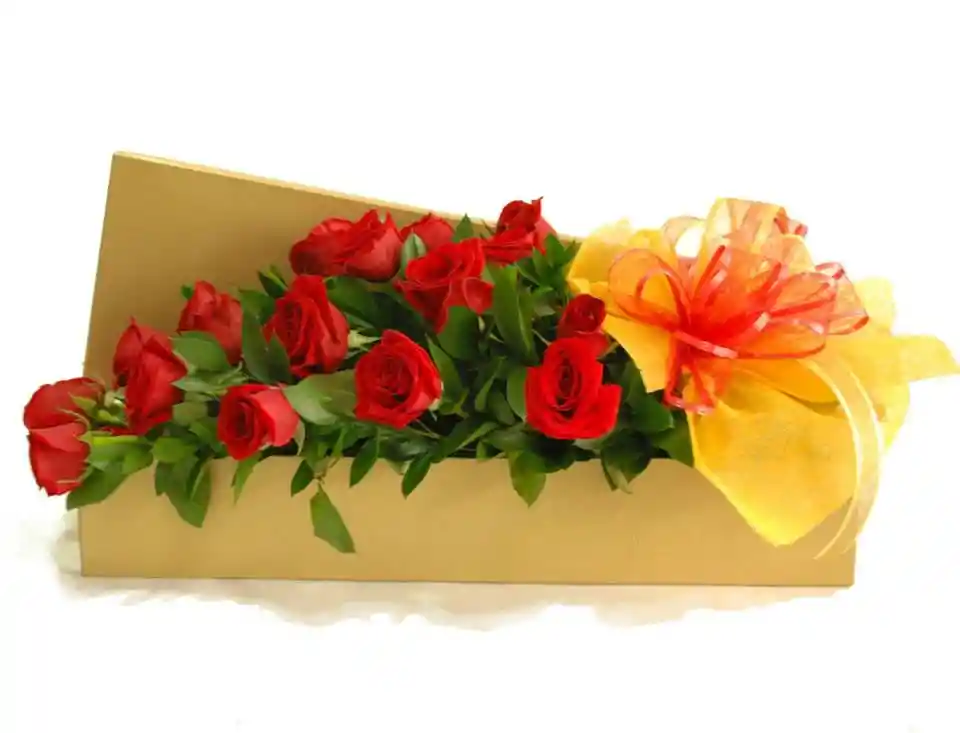 caja rectangular dorada x 15 rosas rojas con follaje, moño y tarjeta