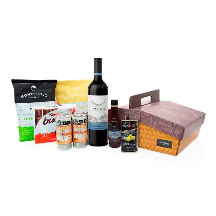 Vino Tinto Trapiche Varietal + Aceitunas Sabor Español + Papas Monte Rojo + Nachos Monte Rojo + Salsa de Maracuya Monte Rojo + Chocolate Kinder Bueno + Fourpack Cerveza Cajica Lata.