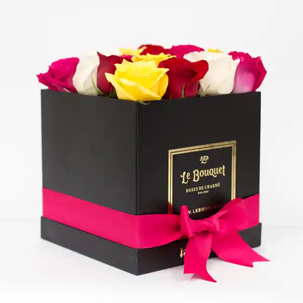 Hermosa caja de inspiración parisina (Blanca o negra) con 16 rosas tradicionales. - Riega medio pocillo de agua cada 3 días en el centro de las rosas- Evita que le den los rayos del sol directamente- No expongas tus rosas a corrientes de aire