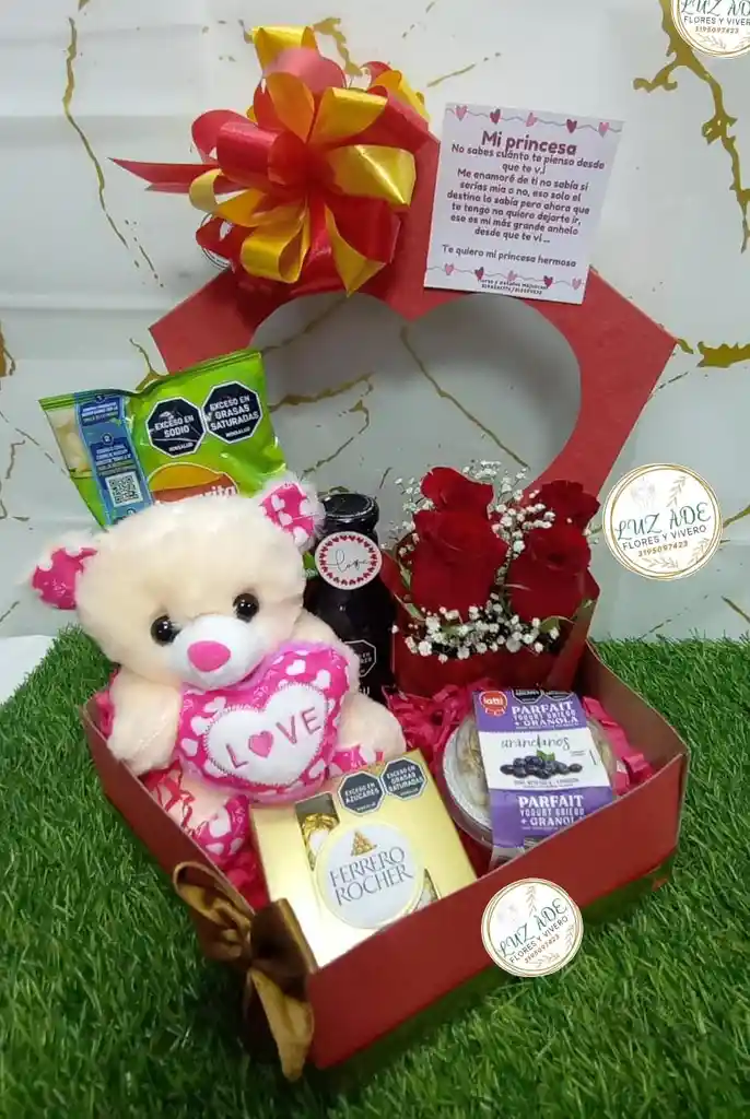 caja preciosa con peluche chocolates mas yogur griego con granola te hatsu y papas margaritas