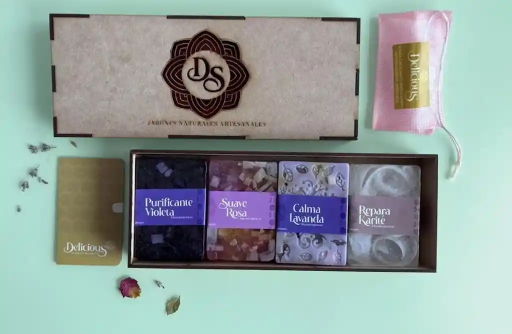 Disfruta una combinación ideal de aromas y suavidad que transforman tu rutina de cuidado personal en un momento mas placentero y relajante. Esta caja premium incluye 4 jabones elaborados con ingredientes que nutren, hidratan y dejan una sensación fresca y delicada en cada uso.
