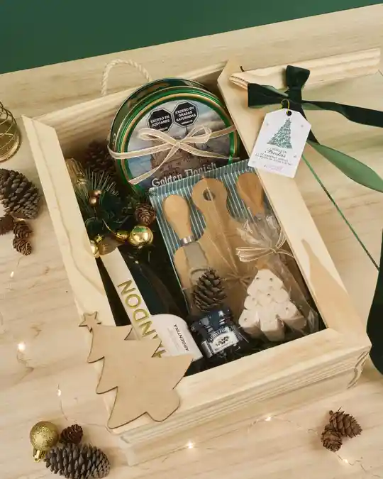 Hermoso caja de pino con acabados premium, cinta de terciopelo verde y decoración navideña elegante, perfecto para celebrar momentos especiales en familia. Incluye: Botella de espumante Chandon con decoración navideña Set de tabla de madera con tres cubiertos para quesos Tarro de galletas danesas Golden Danish Vela navideña artesanal en forma de arbolito Mermelada mini St. Dalfour Detalles decorativos: piñas secas, ramitas de pino y acentos naturales festivos Caja de madera premium con tapa de vidrio y moño de terciopelo