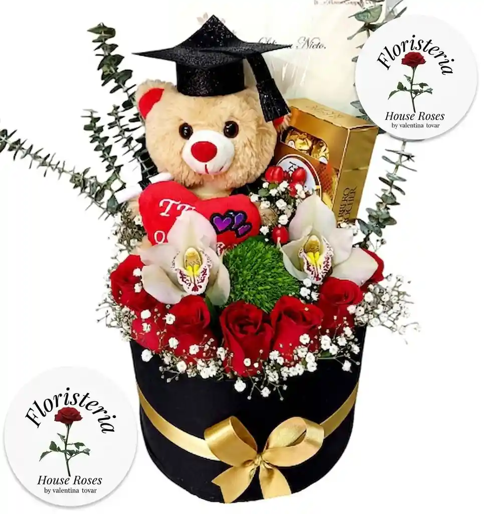 Hermosa caja elegante que combina rosas rojas frescas, orquídeas, follaje fino y un tierno peluche con birrete, acompañada de chocolates. Un detalle perfecto para celebrar logros, graduaciones o sorprender con amor y orgullo.