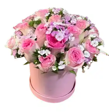 Arreglo en caja cilíndrica color rosa con rosas en tonos rosa claro y medio, minirosas, flores de temporada en rosa pálido/blanco (tipo stock/dianthus) y follaje verde. Un detalle romántico y delicado para cumpleaños, aniversarios, bienvenida de bebé o agradecimientos. Presentación premium e incluye tarjeta dedicatoria. Entrega rápida el mismo día.