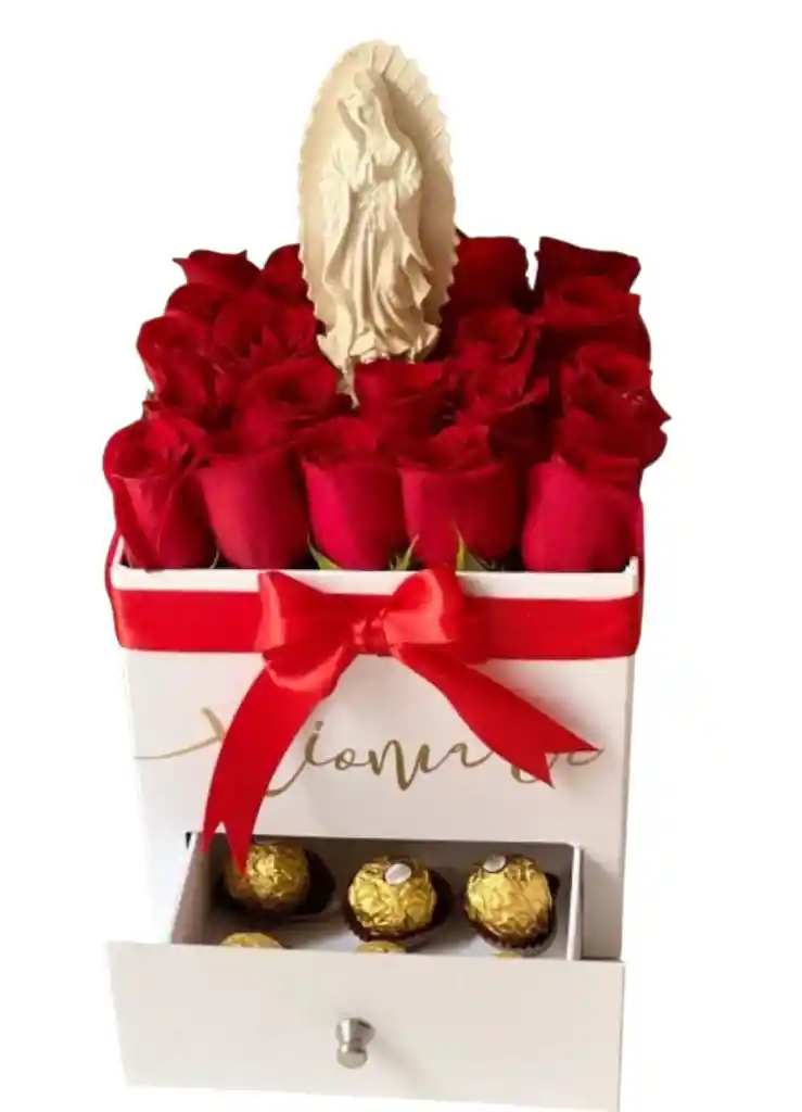 Caja estilo gaveta lleva 6 chocolates ferreros 24 rosas virgencita lazo cinta
