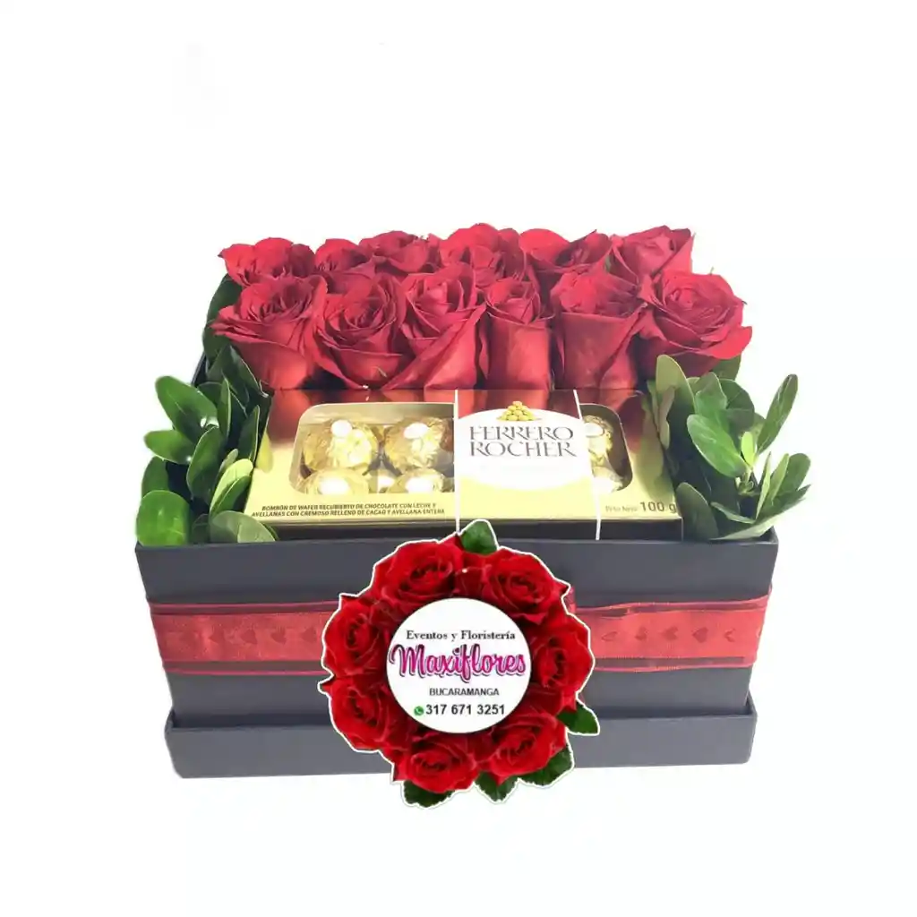 CAJA RECTANGULAR CON ROSAS ROJAS + CAJA DE CHOCOLATES