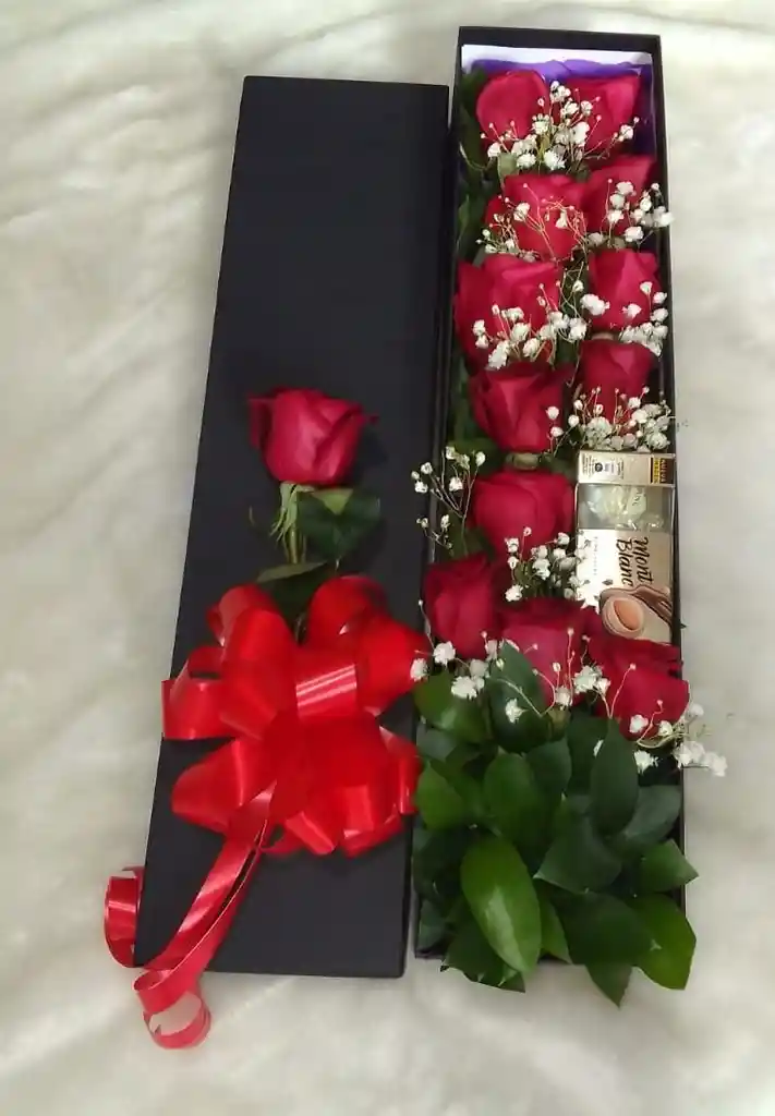 Caja rectangular de 12 rosas rojas con chocolates Montblanc