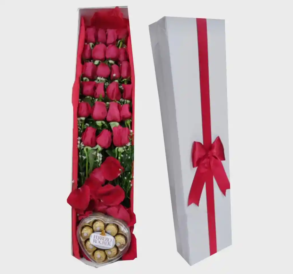 Caja rectangular con 24 rosas y Ferrero rocher corazón y tarjeta personalizada si el cliente lo desea. *El color de la rosa puede variar según disponibilidad