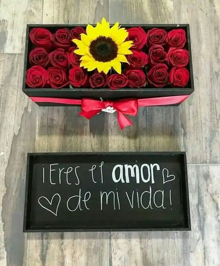 Incluye: Girasol x1, rosas rojas x22, decoracion en caja rectangular y mensaje personalizado