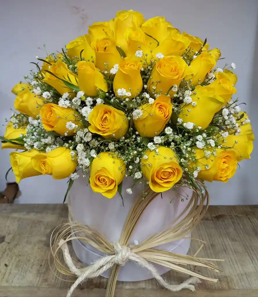 Caja con rosas, yipso, ruscos y moño