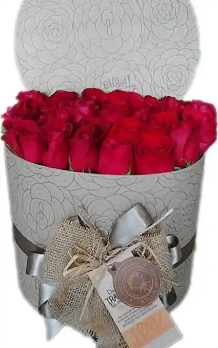 Caja redonda con rosas. El color de la rosa sera según disponibilidad en tienda. Medidas 25 cms. de diámetro por 27 cms. de alto