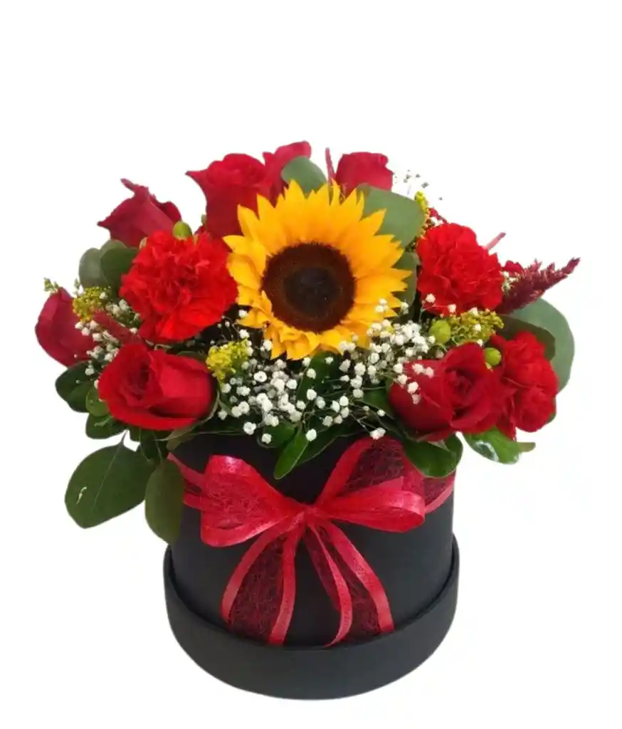 Caja redonda con 12 rosas, clavel y girasol Incluye: Moño artesanal y fino follaje. Personalización: Si deseas agregar una tarjeta con mensaje o remitente, por favor escríbelo en la sección de "Comentarios" al realizar tu pedido o indícalo por el chat a tu Rappitendero.