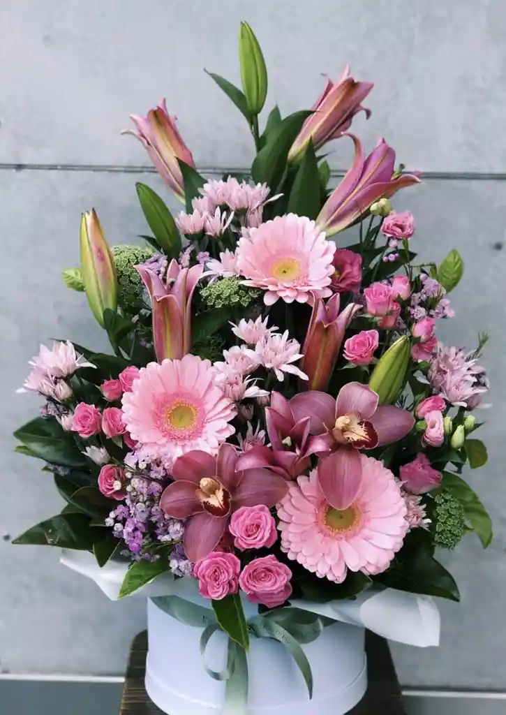 Caja redonda de mix de flores rosadas 4 gerberas , 6 lirios y mini rosa Un elegante arreglo floral en caja redonda con una hermosa combinación de flores rosadas, perfecto para transmitir dulzura, ternura y cariño en cualquier ocasión. Nota: La flor puede ser sustituida dependiendo de la disponibilidad de color y del producto. "Mensaje Personalizado" máximo de 30 caracteres (Dejar el mensaje en el chat, los comentarios no se previsualizan para la tienda, por lo que si se dejan allí no podrá ser incluido).