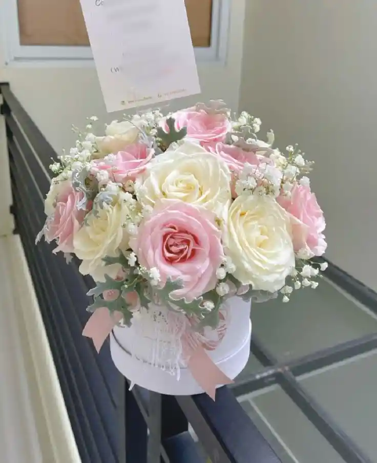 Caja redonda de rosas blancas y rosadas Un sofisticado diseño en caja redonda con una dulce combinación de rosas blancas y rosadas, ideal para transmitir ternura, cariño y elegancia. Nota: La flor puede ser sustituida dependiendo de la disponibilidad de color y del producto. "Mensaje Personalizado" máximo de 30 caracteres (Dejar el mensaje en el chat, los comentarios no se previsualizan para la tienda, por lo que si se dejan allí no podrá ser incluido).