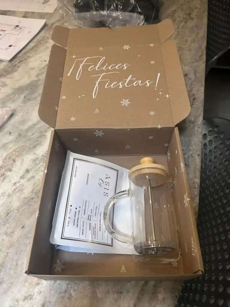 Caja regalo que incluye, café de especialidad, prensa francesa y caja decorativa de cartón.